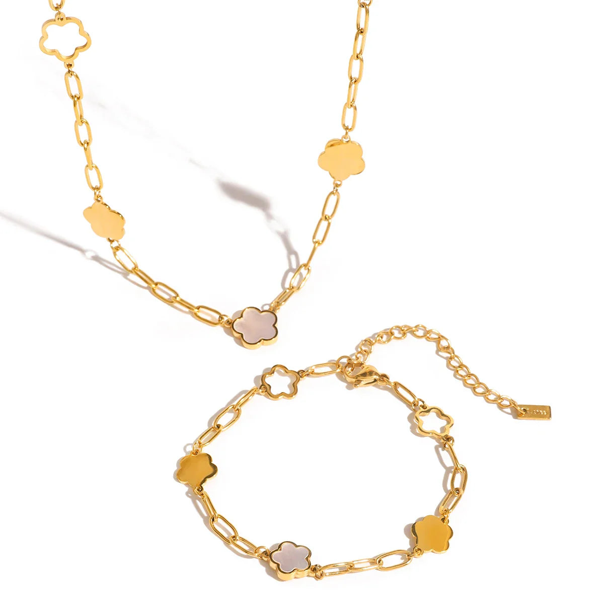 This elegant Flower set includes a finely crafted necklace and matching bracelet, designed to complement each other perfectly. Both pieces feature delicate floral motifs that add a touch of sophistication and natural beauty to any outfit. Expertly made with attention to detail, this set offers versatile wear for both everyday elegance and special occasions. Enhance your jewelry collection with this harmonious pairing that balances style and subtle charm.