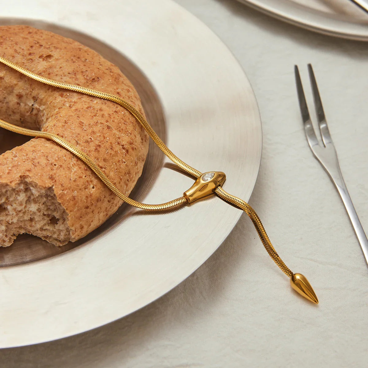 This Snake necklace combines sleek design with expert craftsmanship, offering a distinctive accessory that enhances any outfit. Its smooth, sinuous form mimics the elegant movement of a snake, providing a bold yet refined statement piece. Crafted with attention to detail, this necklace is perfect for those seeking a unique and sophisticated addition to their jewelry collection.