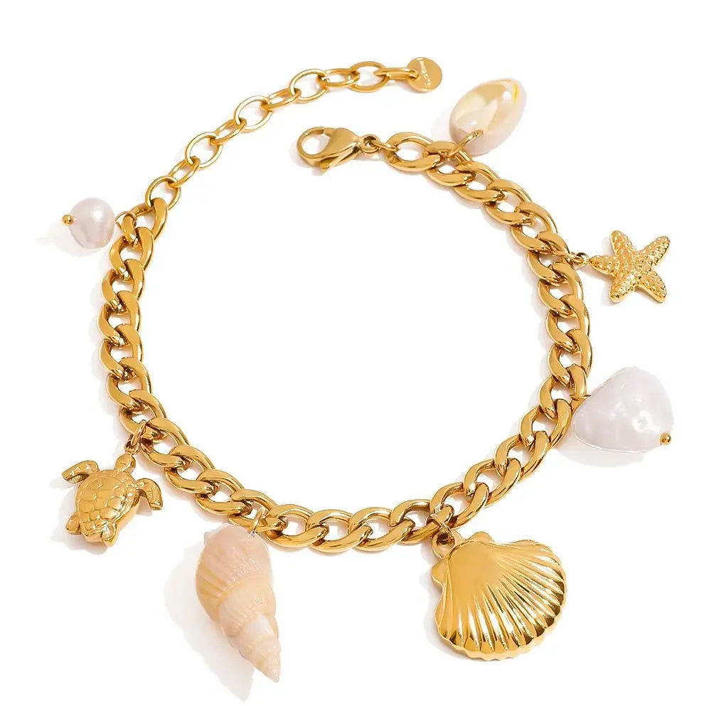 This Youthway bracelet features delicate shells and starfish metal charms crafted from durable stainless steel, making it an ideal accessory for vacation or everyday wear. Its corrosion-resistant material ensures lasting shine and strength, while the charming design adds a subtle coastal elegance. Perfect as a thoughtful gift or a stylish addition to your jewelry collection.